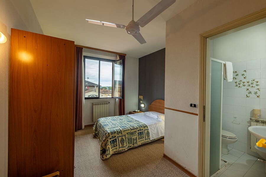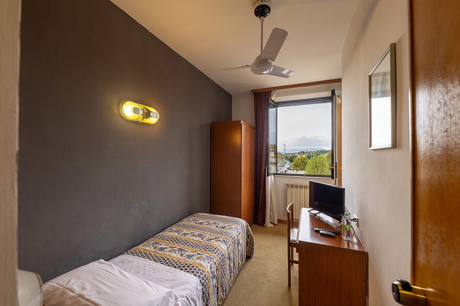 The single rooms at Hotel Centrale offer comfort and convenience for solo travelers. Each room features a French bed (three-quarter size), a fully equipped private bathroom, free Wi-Fi, a fan, and a TV. All rooms overlook the city, providing a bright and pleasant atmosphere.